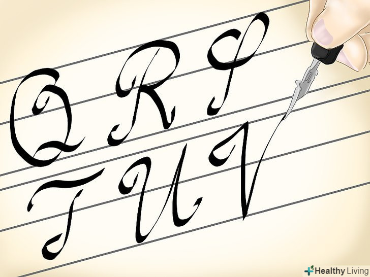 Навчіться писати спадний штрих. букви b, f, h, i, j, K, l, m, n, P, r, s, t, u, v, w, x, y і z починаються зі штриха вниз. У деяких буквах цей штрих доходить до верхньої базової лінії, в деяких — до середини. Буква " f " буде виходити за нижню лінію. У цих буквах основний спадний штрих пишеться справа наліво. [18]