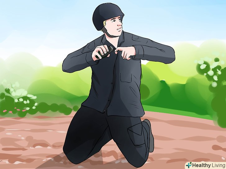 Лежачи на спині, видаліть чеку. з усіх положень кидка гранати, положення лежачи, як правило, передбачає найменшу кількість сили, відстані і точності, таким чином, коли можливі інші позиції, вони краще. Однак в ситуаціях, коли ви перебуваєте за дуже низьким укриттям, ви не можете ризикувати і піддавати себе ворожому вогню. Не поспішаючи, спробуйте встати в положення на коліна. У тих випадках, коли кидок лежачи, може бути єдиним способом завдати удару ворогові, не піддавайте себе смертельній небезпеці.- Щоб почати, ляжте на спину за укриттям. Ви повинні лежати паралельно помаху вашої руки при кидку, розташованої далеко від вашої мети. Це дозволить вам легко захопити і підготувати гранату біля вашої грудей, а також відкриває вам найкращі варіанти укриттів від вибуху.