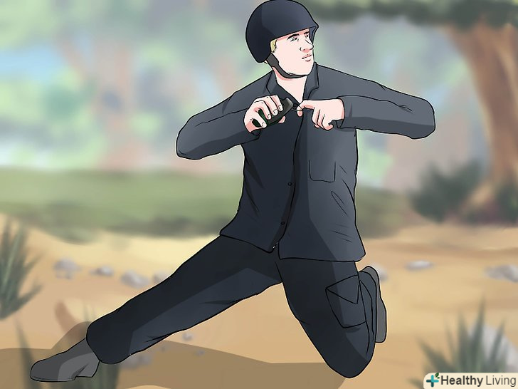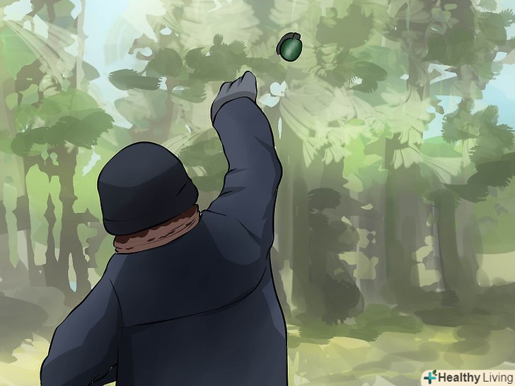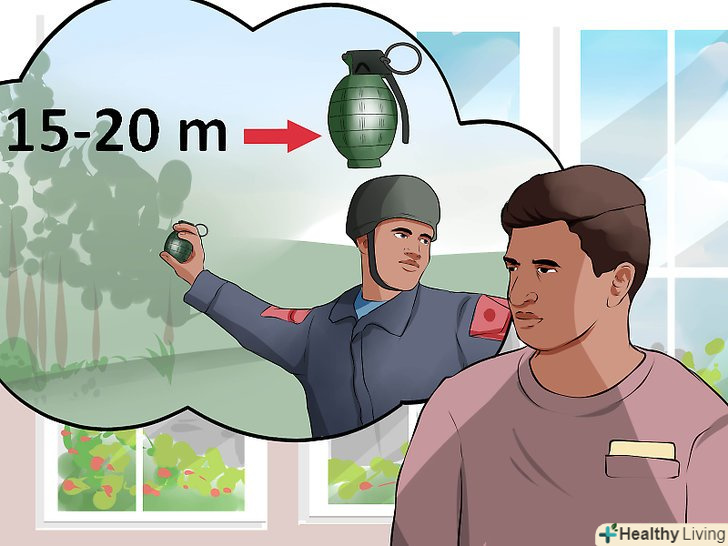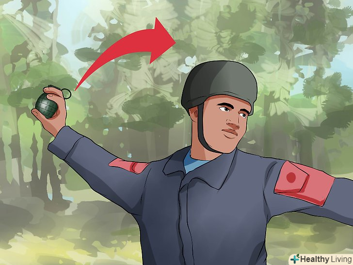 Кидок рухом зверху вниз. запустіть гранату за голову, пронісши руку повз вуха і повернувшись в стегнах. Для збільшення сили кидка відсуньтеся в сторону.- Не забудьте сховатися! Розташуєтеся максимально низько за найміцнішим найближчим укриттям. Як завжди, якщо немає найближчого укриття, притисніться з силою до землі проти напрямку вибуху.