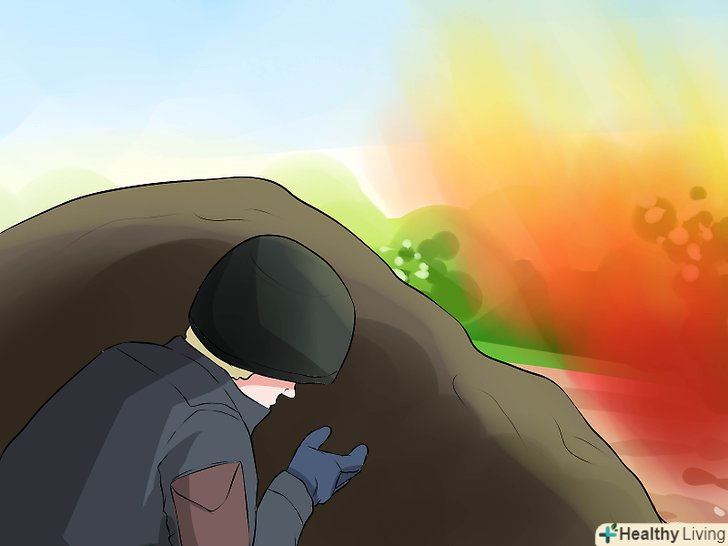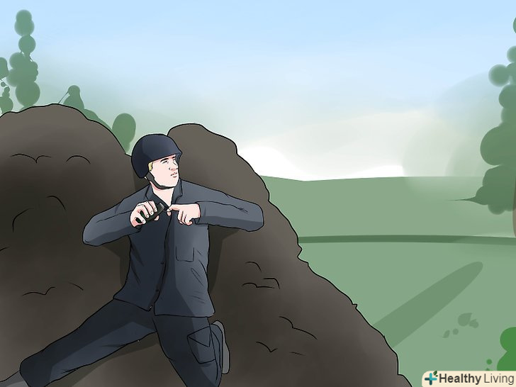 Сховайтеся! використовуйте час, який у вас є перед вибухом гранати, щоб захистити себе. Присядьте, встаньте на коліна або сховайтеся за будь-яким доступним покриттям, щоб захистити себе від осколків. Слід мати на увазі, що в таких ситуаціях, в яких ви, ймовірно, будете використовувати гранату, ви, швидше за все, захочете сховатися не тільки від вибуху гранати, але також і від ворожого вогню, тому не витрачайте час даремно і ховайтеся.- Якщо немає ніякого укриття, ляжте і притисніть до землі, проти напрямку насувається вибуху. Це убезпечить вас, знижуючи ризик пошкоджень вашого тіла. [6]
