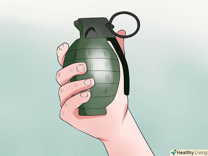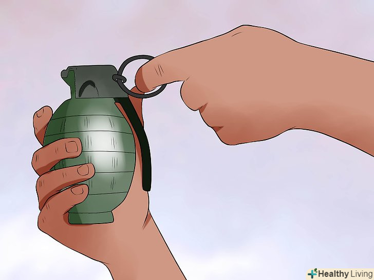 Захоплення гранати в руці для кидка. коли Ви знайшли ціль, і готові кинути гранату, захопіть її в тій руці, яку ви зазвичай використовуєте для кидка. Візьміть гранату в долоні вашої руки з чекою. Використовуйте великий палець, щоб надати стійкий тиск на важіль безпеки - великий, квадратний, металевий важіль, що йде від вершини до низу гранати.- Не послаблюйте тиску на важіль, поки ви не будете готові кинути її. Важіль вважається маленькою, але дуже важливою частиною гранати, якщо ви послабите свою хватку після того, як потягніть чеку, то може статися удар і вибух, в той час як граната знаходиться все ще у вашій руці [4] оскільки це може бути смертельно, важливо призвичаїтися зберігати стійкий тиск на важіль в будь-якому випадку перед кидком.