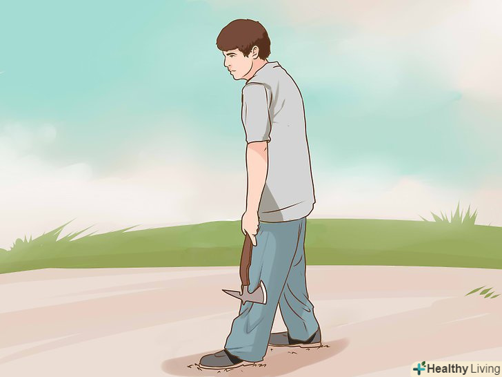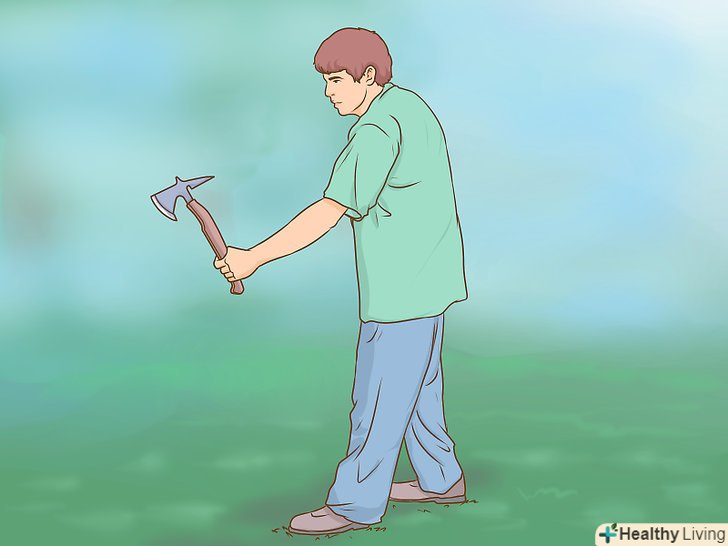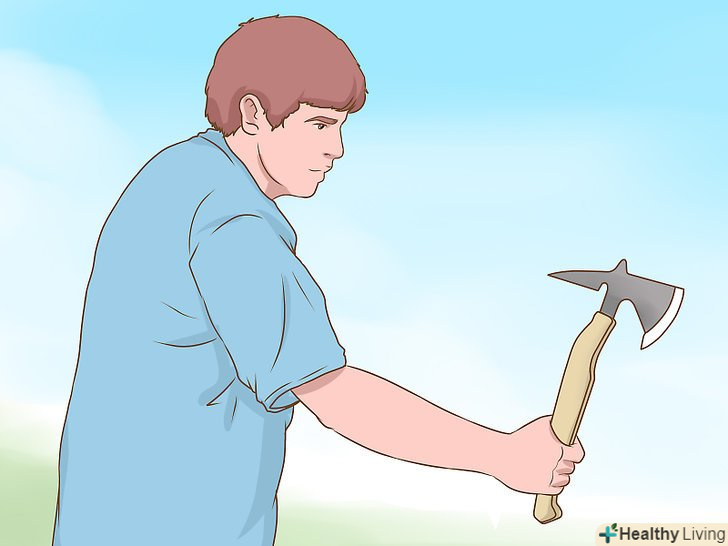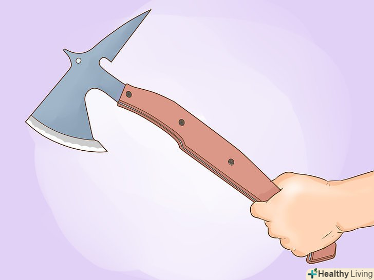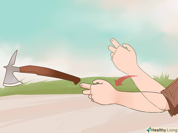 Тримайте правильно томагавк. направте ручку до себе і на відстані 4-7 см від кінця ручки візьміться за неї так, як ви б потиснули руку в міцному діловому рукостисканні. Великий палець підставте під рукоятку так, як Ви б тримали молоток, а не зверху на рукоятку – не так, як Ви б тримали ніж. [2]- Дуже важливо не ставити палець зверху на рукоятку. Це сильно впливає на обертання томагавка, тобто при польоті томагавк буде сильно крутитися. Такий кидок зазвичай закінчується гучним дзвоном, коли томагавк не встряє в ціль. Обігніть палець навколо рукоятки так, щоб вам було зручно.