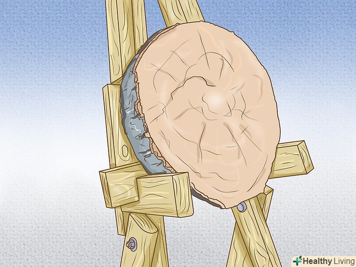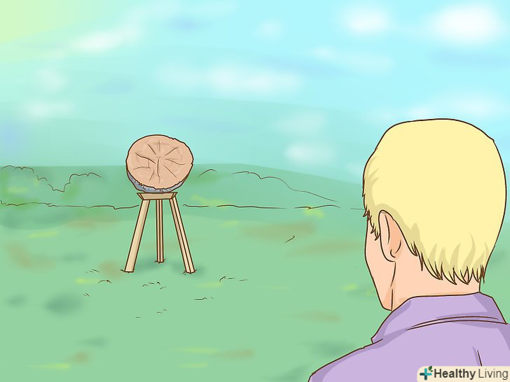 Дістаньте мішень. вам потрібно щось дерев'яне, куди буде встрявати томагавк. Бажано-сухе дерево, щоб воно не постраждало від зарубок, які залишаться від ваших майстерень кидків. Як правило, любителі покидати томагавк використовують зріз сухого пня товщиною мінімум 15-20 см.зріз ставлять на підставку.- Якщо ви буде кидати томагавк не в дерево, а в іншу круглу мішень, він може не застрягти і відскочити в будь-якому напрямку.
