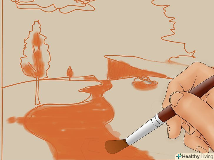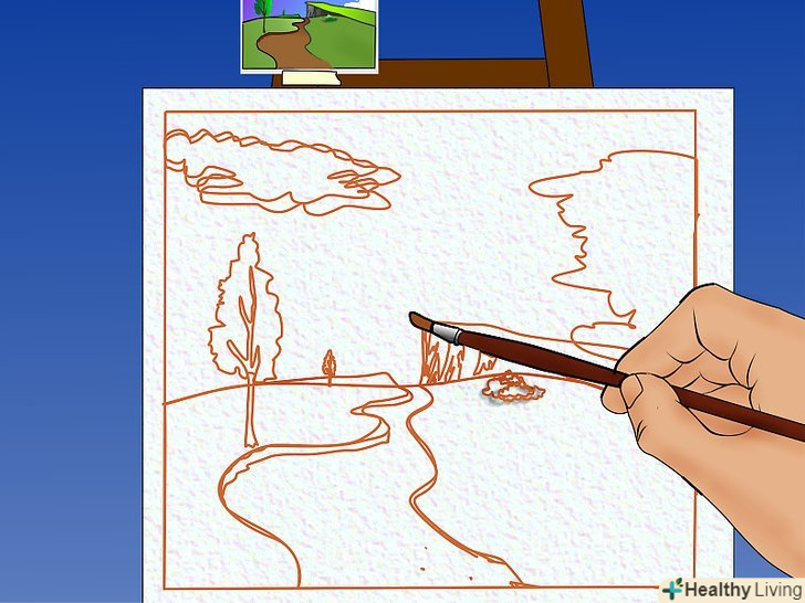Розведеною Сієною зробіть на полотні начерк майбутнього пейзажу. нанесіть всі основні об'єкти. Намагайтеся, щоб лінія горизонту перебувала на відстані 1/3 або 2/3 від верху полотна, в залежності від того, яку частину вихідної фотографії займає небо.