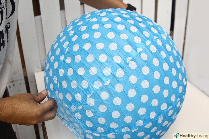 Прив'яжіть волосінь до верхньої частини хмари. під шаром матеріалу знайдіть верхню дротяну дугу всередині ліхтарика. Прив'яжіть до неї шматок волосіні. Якщо ви з'єднали кілька ліхтариків, то прив'яжіть волосінь до кожного з них. Після цього перекрийте проміжки у верхній частині ліхтарика за допомогою додаткового волокна. [7]