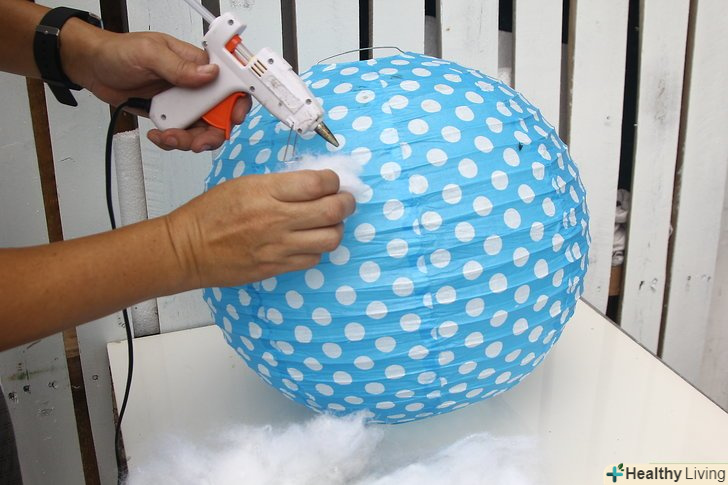 Заповніть прогалини невеликими пучками матеріалу. тепер наносите клей прямо на ліхтарик і швидко притискайте до нього волокно. Якщо ви склеїли кілька ліхтариків, не забудьте закрити місця з'єднань. [3]