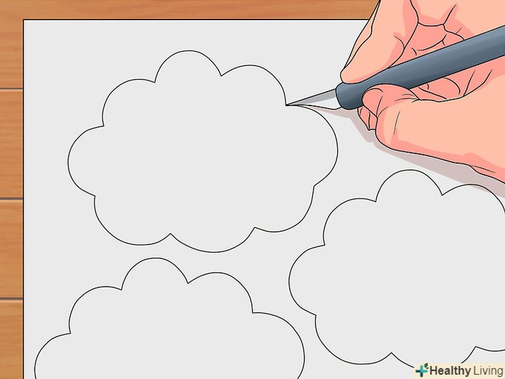 Акуратно виріжте кожну хмару окремо. візьміть ножиці або канцелярський ніж, щоб вирізати всі хмари по контуру. Намагайтеся різати уздовж внутрішньої частини лінії, щоб по краях не залишалося помітних олівцевих відміток. [11]- Акуратно зітріть випадкові олівцеві позначки гумкою. Слідкуйте, щоб при цьому краю паперу не загорталися!
