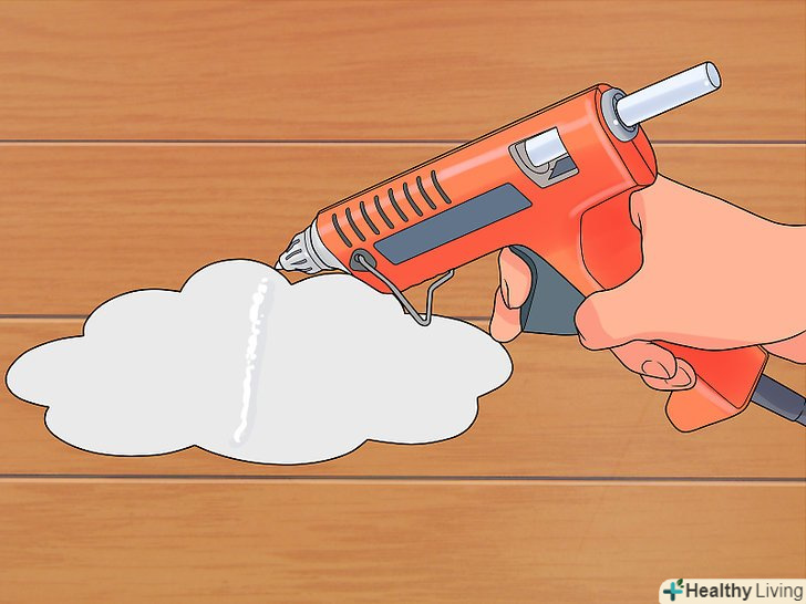 Нанесіть тонку смужку гарячого клею вздовж центру однієї Хмари. нагрійте клейовий пістолет. Покладіть одну хмару на стіл перед собою. Нанесіть тонку смужку клею рівно по центру цієї хмари. [12]