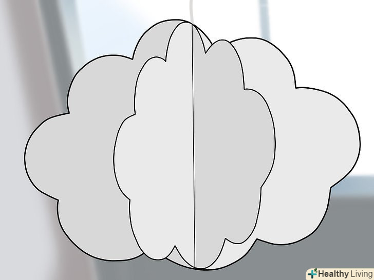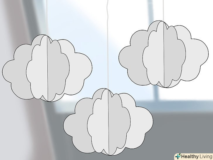 Зробіть кілька хмар. не обов'язково задовольнятися однією хмарою! Повторіть всі дії, щоб зробити кілька хмар. Відріжте шматки волосіні різної довжини, щоб Хмари звисали на різній висоті. Для додаткового ефекту до одного шматка волосіні можна прикріпити кілька хмар. [16]- Кожна об'ємна хмара складається з двох білих заготовок. Якщо ви хочете зробити конструкцію з шести об'ємних хмар, вам знадобиться вирізати 12 заготовок з білого паперу.