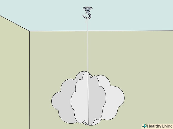 Закріпіть хмару. вкрутіть в полоток невеликі гаки. На кінцях волосіні зробіть маленькі петлі. Накиньте петлі на гаки. Для кожного ліхтарика потрібен окремий гак. Якщо хмара складається з трьох ліхтариків, то буде потрібно три гака.