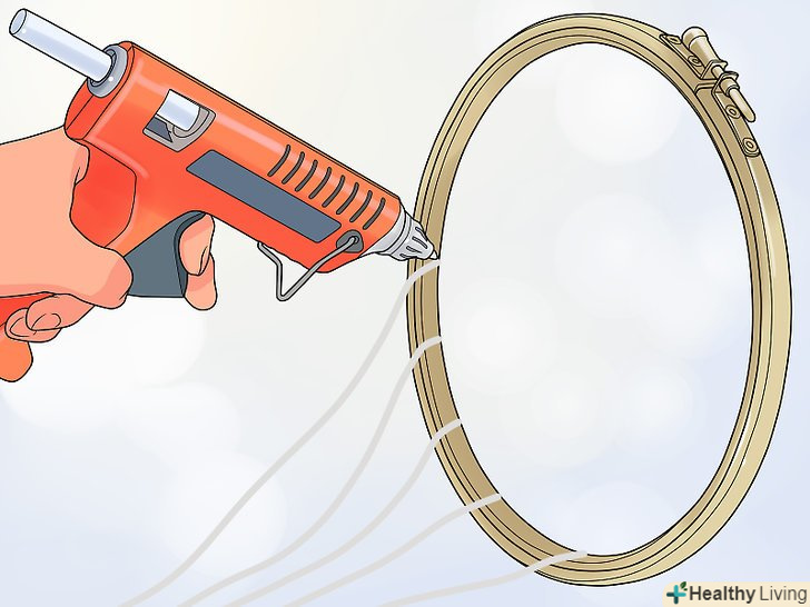 Приклейте верхні краї волосіні по колу уздовж внутрішнього краю п'яльців (необов'язковий етап). Так як п'яльці мають круглу форму, вони відмінно підходять для переносної конструкції з хмарами. Всі хмари можуть звисати на різній висоті, але шматки волосіні необхідно закріпити на п'яльцях на одному рівні. Волосінь повинна опускатися від круглого обідка до хмар. [17]- Коли клей висохне, зберіть разом всі верхні кінці волосіні. Зробіть вузол, щоб з'єднати їх між собою. Підвісьте переносну конструкцію за вузол в будь-якому місці будинку!