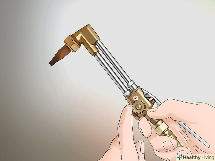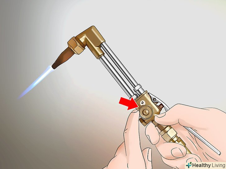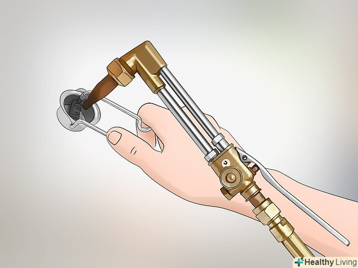 Закрийте вентилі пальника. після відпалу міді можна загасити полум'я. Поверніть ацетиленовий вентиль проти годинникової стрілки, щоб перекрити потік газу. Потім закрийте кисневий вентиль. Після цього полум'я має згаснути. Тепер можна зняти захисні окуляри. [12]- Спочатку слід перекрити потік ацетилену, а потім кисню, щоб вигорів весь ацетилен.