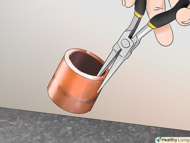 Візьміть відпалену мідь плоскогубцями. відразу після відпалу мідь буде дуже гарячою, тому до неї не слід торкатися голими руками. Підсуньте під край мідної пластини або труби одну губку плоскогубців, міцно стисніть їх і підніміть відпалену деталь. [13] якщо у вас немає плоскогубців, їх можна придбати в магазині господарських товарів.- На цьому етапі (і в процесі відпалу) немає необхідності надягати рукавички, оскільки ви не будете торкатися до металу, поки він не охолоне.