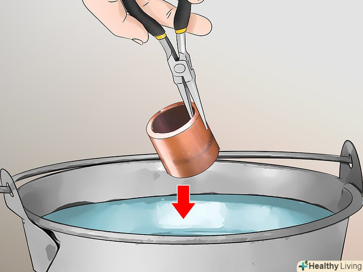 Покладіть відпалену мідь в металеве відро з водою. в результаті розпечена до червоного мідь відразу ж охолоне. Слідкуйте за тим, як метал охолоджується. [14] як тільки мідь придбає свій звичайний червонувато-коричневий колір, дістаньте її з металевого відра за допомогою плоскогубців.- Процес охолодження повинен зайняти не більше 5 хвилин. Після закінчення цього часу відпалена мідь стане м'якою і податливою.