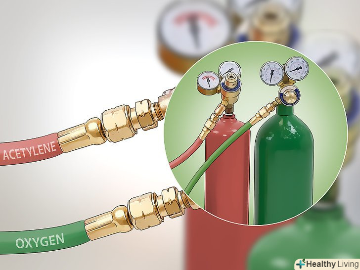 Підключіть по одному шлангу до кожного балона, щоб підготувати ацетиленовий пальник. сама пальник, яка випускає полум'я, має два виходять з неї шланга. Підключіть червоний шланг пальника до ацетиленового, а Чорний - до кисневого балона. Ацетилен запалить полум'я, після чого кисень продовжить підживлювати його. Змінюючи кількість надходить з балона кисню, ви зможете контролювати інтенсивність полум'я.- Для початку переконайтеся, що два манометра на кисневому балоні і обидва манометра на ацетиленовому балоні встановлені на «0». [2]