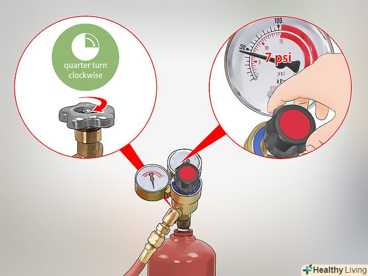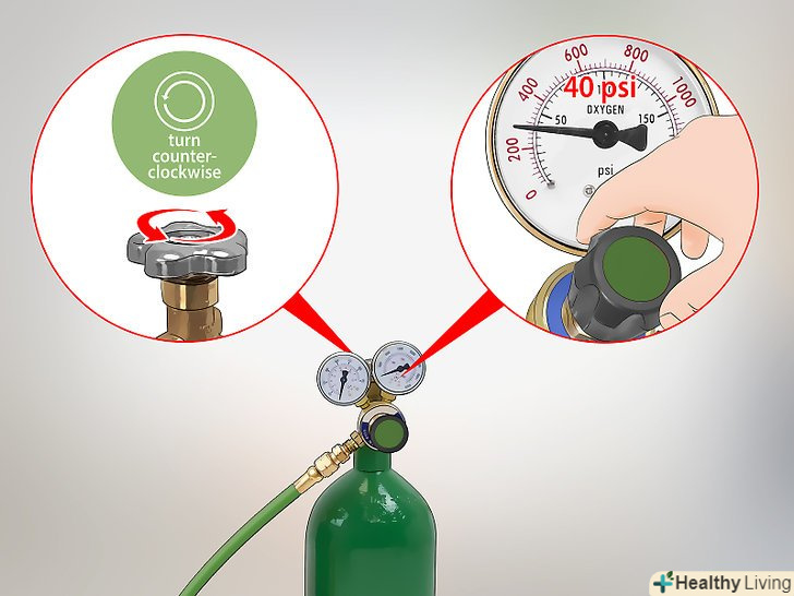 До кінця відверніть вентиль на балоні з киснем проти годинникової стрілки. потім відрегулюйте тиск за допомогою гвинта на редукторі (повертайте його за годинниковою стрілкою). При цьому стежте за манометром на кисневому балоні — добийтеся того, щоб він показував 2,7 атмосфери. [4]- Кисневий вентиль розташований у верхній частині балона з киснем. На ньому може бути стрілка, яка вказує на те, в який бік слід відкручувати вентиль.