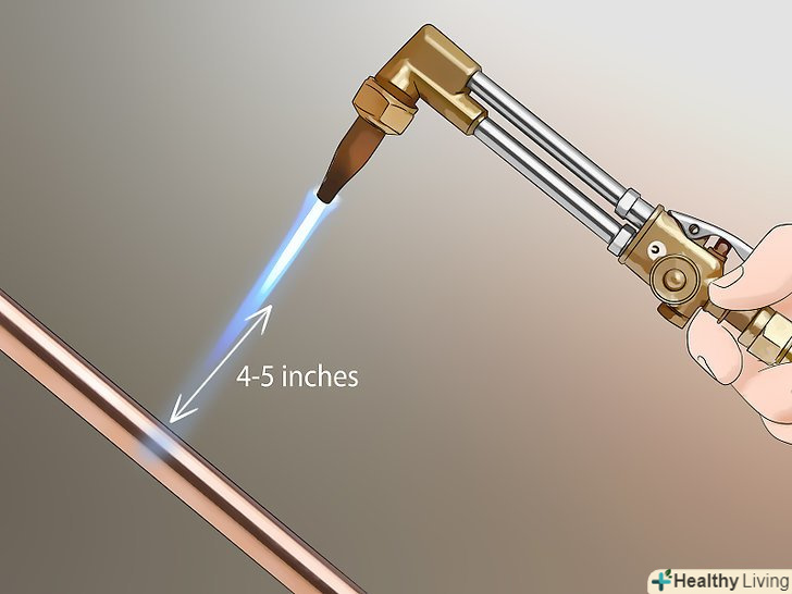 Відрегулюйте вентиль на пальнику так, щоб полум'я стало блакитним. після того як пальник почне випускати світло-помаранчеве полум'я, поверніть кисневий вентиль збоку пальника за годинниковою стрілкою, щоб подати в палаючий ацетилен кисень. Продовжуйте крутити вентиль до тих пір, поки полум'я не стане блакитним. [6] блакитний колір полум'я свідчить про те, що його температура ідеально підходить для відпалу міді.- Крутите кисневий вентиль повільно, щоб уникнути раптового спалаху полум'я.