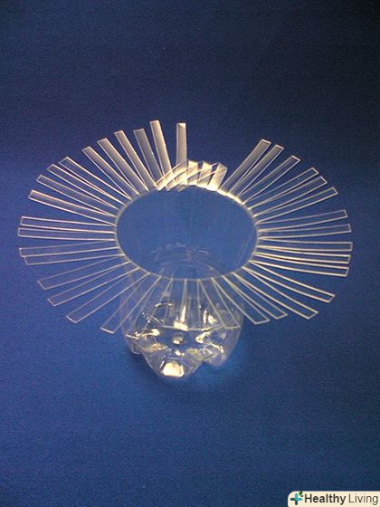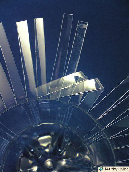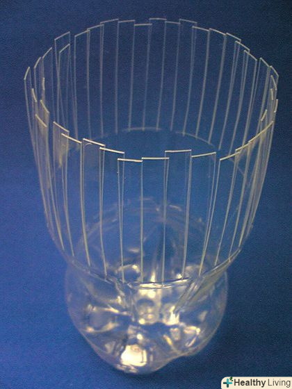 Відміряйте і зробіть рівні горизонтальні розрізи по всій окрузі пляшки. потім розріжте кожен сегмент навпіл і потім знову навпіл, щоб у вас вийшли тонкі і рівні смужки.