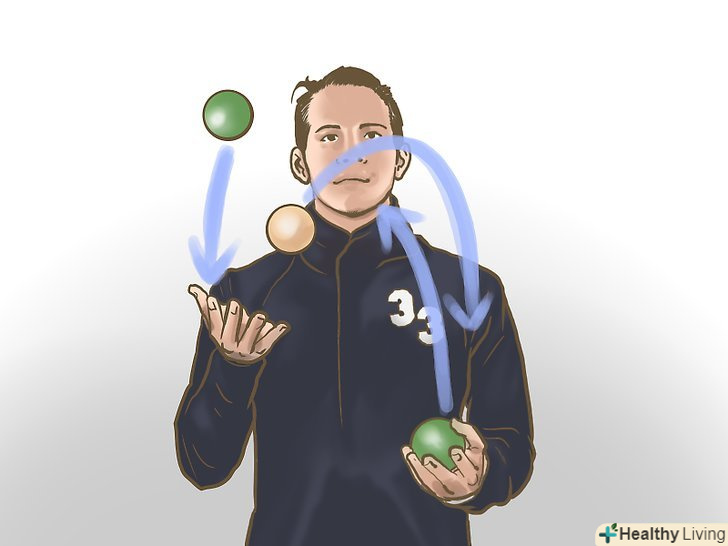 Жонглюйте трьома м'ячами. постарайтеся кидати три м'ячика по черзі. Почніть повільно, просто щоб зрозуміти, як рухаються три м'ячі в повітрі. Часто, найголовніше при жонглюванні трьома м'ячами, це зрозуміти по якій траєкторії рухаються м'ячі в повітрі. В основному, в повітрі буде знаходитися тільки один м'яч, а інші два м'ячі будуть у вас в руці.- Для початку, тримайте два м'ячі в правій руці, і один в лівій (або навпаки, якщо ви лівша)
