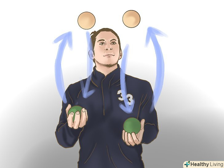- Візьміть по одному м'ячику в кожну руку. підкиньте перший м'ячик, і коли він дійде до максимальної висоти, підкиньте другий м'яч. Продовжуйте практику до тих пір, поки ви не будете впевнено володіти двома м'ячами.