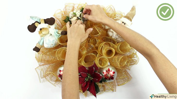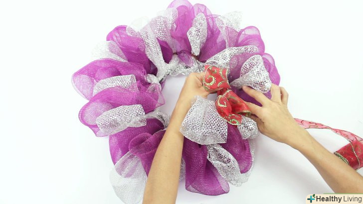 Збийте стрічку. поправте все бантики так, щоб нижня частина дивилася вниз по діагоналі, а верхня - вгору. В результаті у вас повинен вийде пишний вінок, а металевий каркас повинен бути надійно захований під стрічками. [13]