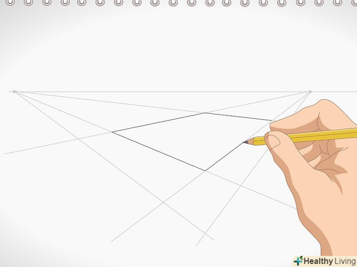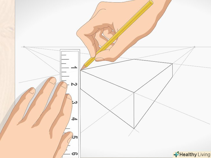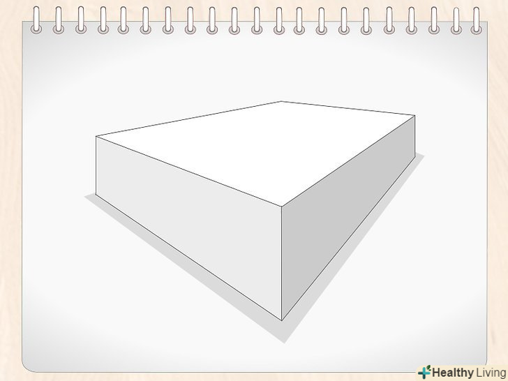 Використовуйте лінії перспективи, щоб як тренування намалювати плоску верхню частину коробки. Тепер, коли у вас є сітка, вам набагато легше буде намалювати потрібний об'єкт. Щоб потренуватися малювати в двоточкової перспективі, зобразіть уздовж ліній перспективи прямокутну коробку. Спочатку намалюйте плоску верхню частину коробки. [8]- Після того як ви освоїтеся із зображенням простих фігур в двоточкової перспективі, можна перейти до асиметричних об'єктів.
