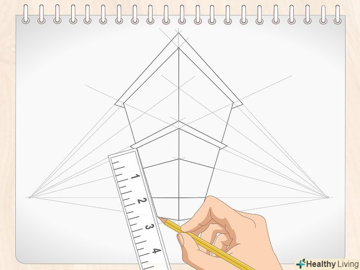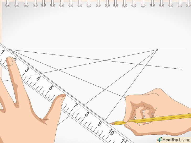 Проведіть з кожної точки сходу 3 або 4 лінії перспективи. прикладіть до точки сходу лінійку і злегка проведіть лінію в тому місці, де ви хочете розмістити який-небудь об'єкт. Потім намалюйте ще 2 або 3 лінії перспективи з цієї ж точки сходу. Виконайте те ж саме для другої точки сходу так, щоб всі лінії перспективи з обох точок перетиналися. [7]- Якщо ви розташували одну точку за межами аркуша паперу, до неї все одно можна прикласти лінійку. Розмістіть лінійку так, щоб вона діставала до аркуша паперу, і проведіть на ньому лінії перспективи.