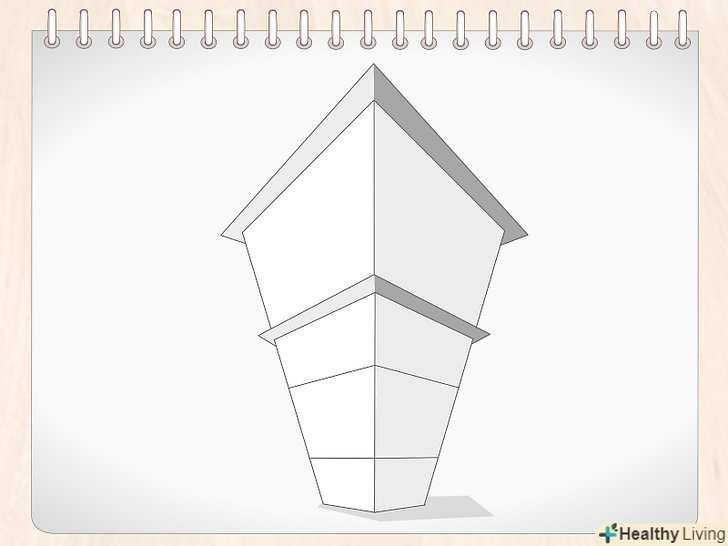 Зобразіть Геометричні фігури з підкресленою глибиною. щоб намалювати будівлю або куб, проведіть лінії перспективи від тих точок сходу, які знаходяться на лінії горизонту. Намалюйте уздовж цих ліній квадрат-це буде підстава. Потім намалюйте об'єкт уздовж ліній перспективи від третьої точки сходу, щоб зобразити бічні сторони, і замкніть нижню частину фігури, використовуючи лінії перспективи від точки сходу на лінії горизонту. [12]- Врахуйте, що в триточковій перспективі вертикальні сторони будівлі або куба не будуть паралельні один одному. У цій перспективі вони повинні бути нахилені під певним кутом вгору або вниз.