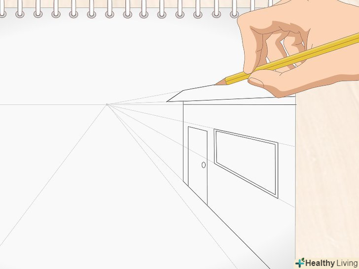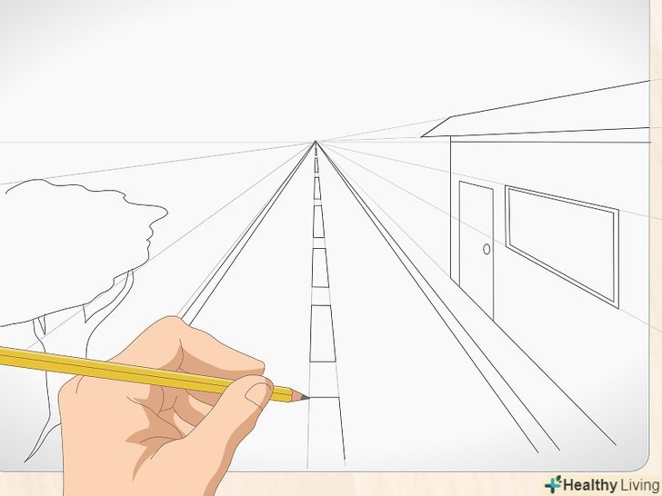 Проведіть лінії від точки сходу. розмістіть лінійку так, щоб вона проходила через лінію сходу на горизонті. Можна нахилити лінійку в будь — якому напрямку і злегка провести олівцем уздовж неї-в результаті у вас вийде лінія перспективи. Зробіть стільки ліній перспективи, скільки захочете. Наприклад, якщо ви малюєте дорогу, досить буде двох ліній, які сходяться в одній точці на горизонті.- Лінії перспективи називають також ортогональними лініями. Їх можна використовувати при малюванні різних предметів, щоб розташувати їх в одноточечной перспективі.