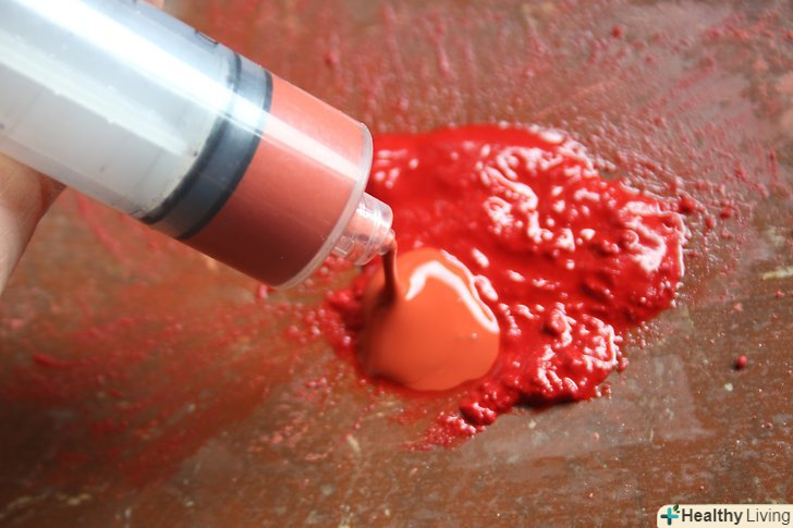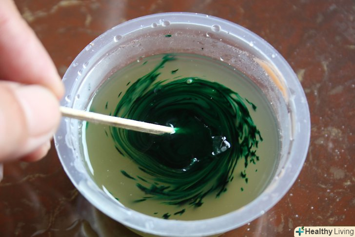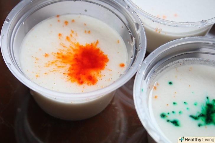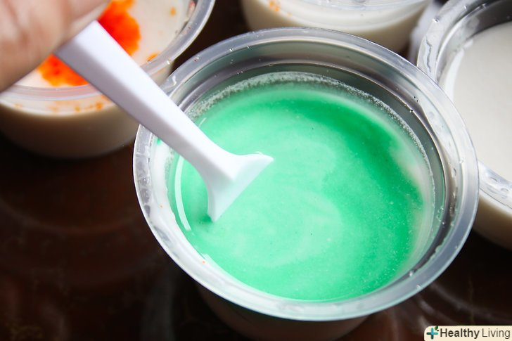 Додайте в отриману основу для фарби по 2 краплі харчового барвника. щоб палітра була досить різноманітною, вам знадобиться кілька різних барвників. Почніть з декількох крапель, щоб не отримати відразу занадто темний відтінок. Краще потім додати в фарбу ще кілька крапель барвника. [10]- Якщо у вас немає барвника потрібного відтінку, змішайте кілька барвників. Наприклад, 2 краплі жовтого і 1 крапля червоного харчового барвника дадуть помаранчевий колір.