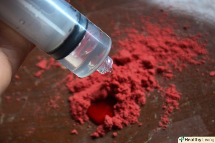 Щоб розтерти пігмент більш тонко, додайте до нього 2 краплі води. додавання невеликої кількості води допоможе досягти потрібної консистенції пігменту. Зробіть в центрі купки пігменту невелике поглиблення. За допомогою медичної піпетки капніть в це поглиблення 2-3 краплі води. [14]- Якщо пігмент занадто зернистий, фарба також може вийти грудкуватою.