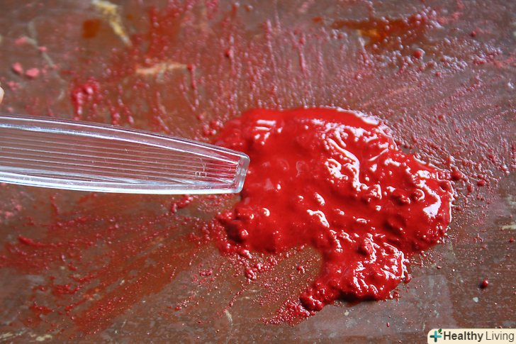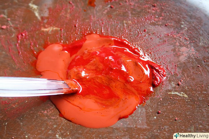 Перемішайте пігмент і воду за допомогою шпателя. розітріть пігмент з водою за допомогою шпателя або мастихіну. Перемішуйте пігмент і воду, поки не вийде однорідна маса, схожа на соус. Постарайтеся позбутися від грудок. [15]- Іноді не вдається розтерти всі грудки на першому етапі. Це не страшно: у вас ще буде така можливість на етапі розведення фарби.