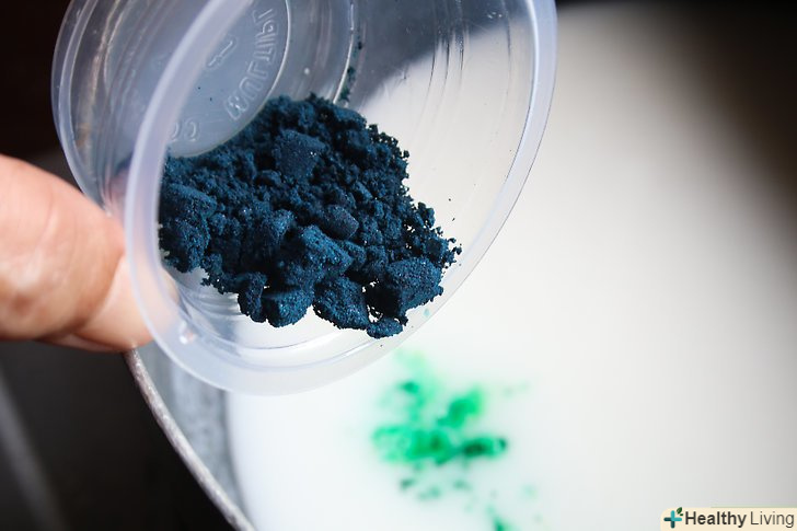 Накапайте в основу для фарби харчові барвники. Візьміть рідкий харчовий барвник потрібного кольору і накапайте 2-3 краплі в основу для фарби. Щоб створити палітру з різних фарб, в ємності з основою треба додати різні барвники. А якщо колір виходить недостатньо інтенсивний, кількість крапель барвника можна трохи збільшити. [3]- Якщо ви не знайшли барвник потрібного кольору, змішайте кілька крапель різних барвників. Наприклад, щоб отримати фіолетовий, можна змішати 3 краплі червоного і 1 краплю синього барвника.