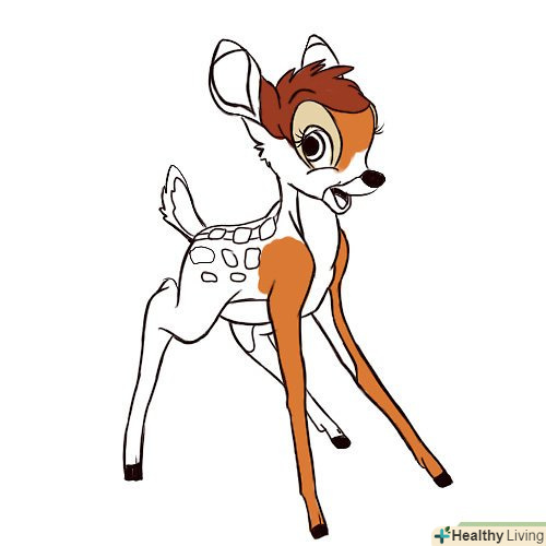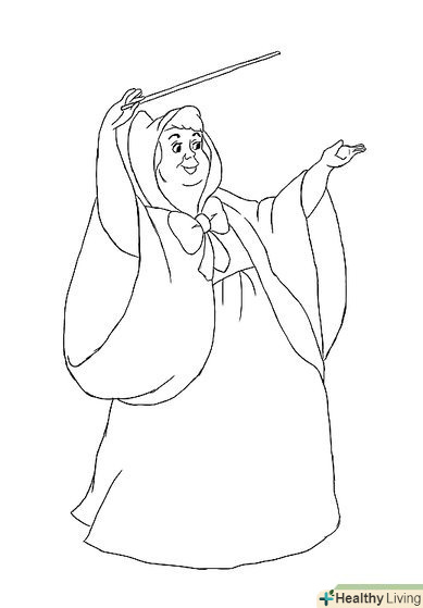Намалюємо Бембі. підкреслимо його довгі ноги і великі очі, що надають йому такий грайливий і невинний вигляд. Розфарбуємо його тіло світло-коричневим, для голови використовуємо трохи темніший відтінок.- Намалюємо Фею хресну з Попелюшки. Щоб намалювати її плащ, використовуємо довгі спрямовуються вниз лінії, особа робимо круглим і добродушним.