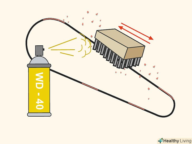 Усуньте стару іржу за допомогою WD - 40 і дротяної щітки.поетапно розпиліть WD - 40 на очищені і іржаві поверхні ланцюга. Зачекайте хвилину, щоб розчин вбрався. Після цього візьміть дротяну щітку і швидко зчистити іржу.[13]- При необхідності протріть ланцюг чистою ганчіркою, щоб видалити залишки іржі. Коли іржа зникне, з'єднайте і / або змастіть ланцюг.