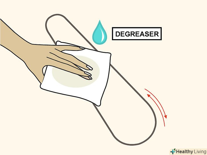 Протріть ланцюг ганчіркою, змоченою в знежирювальному засобі.візьміть чисту ганчірку і змочіть її в знежирювальному засобі. Пропустіть ланцюг через ганчірку, щоб видалити наліт і мастило. Для видалення впертого нальоту може знадобитися більш інтенсивна чистка або полірування ганчіркою.