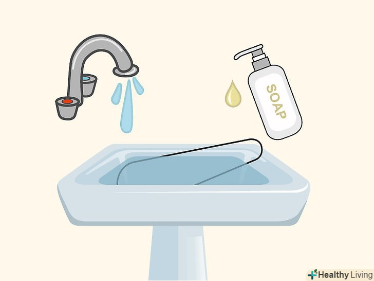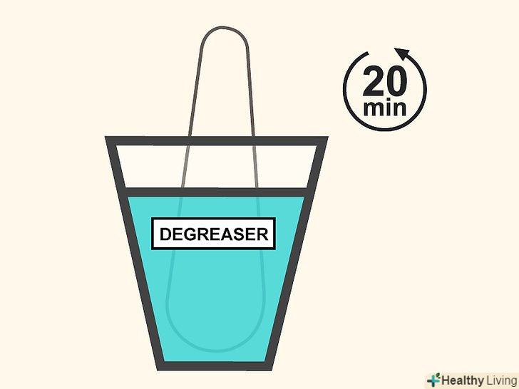 Ланцюга з великою кількістю бруду і нальотом замочіть в знежирювальному засобі на 20 хвилин.для видалення серйозного нальоту вам доведеться замочити ланцюг в знежирювальному засобі. Заповніть ємність знежирюючим засобом, замочіть в ньому ланцюг на 20 хвилин, а потім промийте в другій ємності з гарячою водою.[10]- Більшість знежирюючих засобів можуть обпекти шкіру. Одягайте латексні рукавички, коли маєте справу з знежирюючим засобом, якщо на етикетці не вказано інше.
