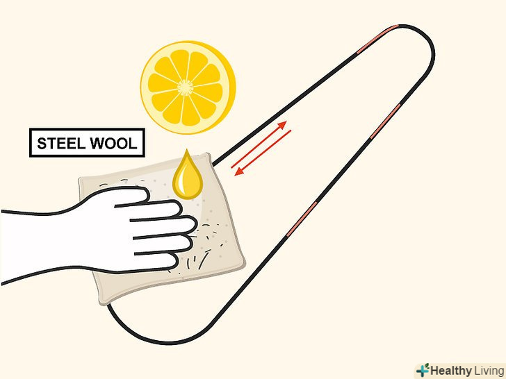 Видаліть легку іржу сталевою мочалкою, змоченою в соку лайма.цей метод видалення іржі шкідливий для шкіри рук, тому не забудьте надіти латексні рукавички. Візьміть металеву мочалку і ретельно змочіть її соком лайма. Мочалкою очистіть заіржавілі ділянки від іржі, а потім протріть поверхню паперовим рушником.[11]- Іржа, яку Ви нейтралізували і видалили з поверхні ланцюга, може засмітити сталеву мочалку. В цьому випадку промийте її в гарячій воді, знову нанесіть сік лайма і продовжите чистку.