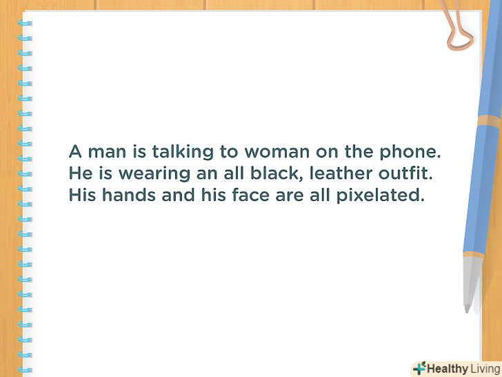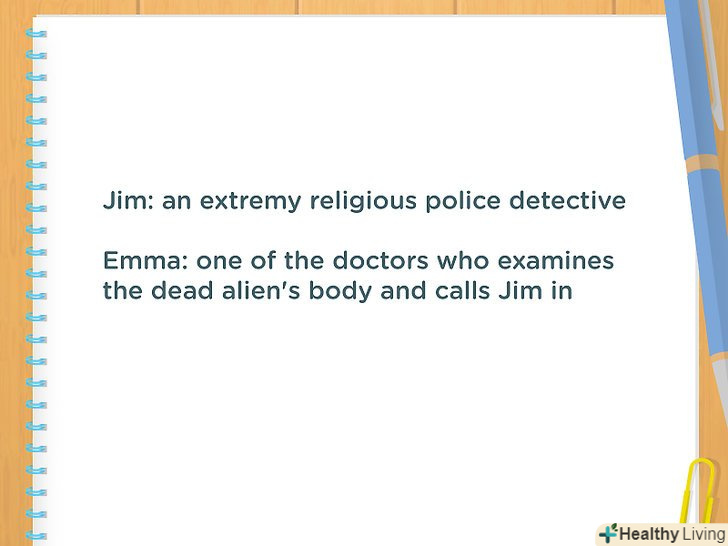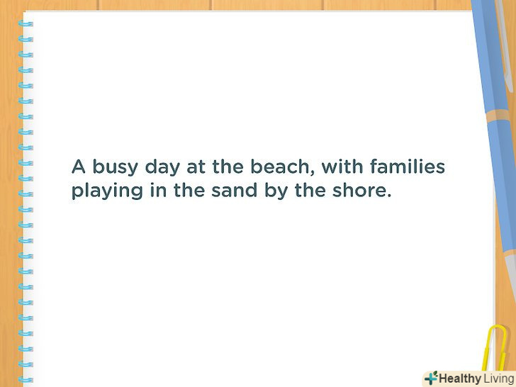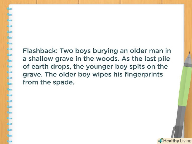 Зосередьтеся на візуальній частині.не забувайте, фільм-це перш за все наочний вид творчості. Використовуйте візуальний ряд на свою користь, щоб залучити глядача. Покажіть дуже захоплюючі або незвичайні кадри. Візуальний ряд повинен сприяти розвитку героя і задавати тон історії.[13]- Наприклад, опишіть місце дії як " сонячні день на пляжі, багато відпочиваючих, які загоряють і граються на піску». Також можна описати персонажа як " зелений прибулець з сумкою на поясі».