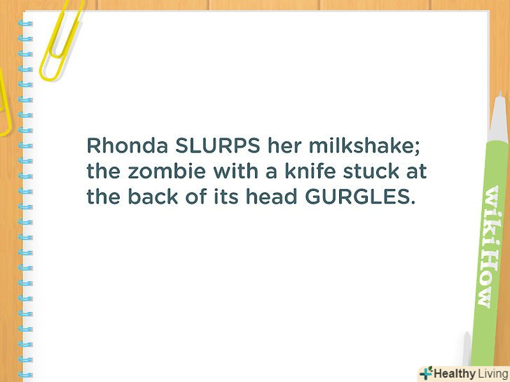 Вказуйте звуки в сценарії.звук або шум вказують в сценарії великими літерами, так як це допомагає надати сценам гостроти відчуттів.- Наприклад, напишіть: "Роман ЧАВКАЛ під час сніданку» або «зомбі гарчав у ліжку».