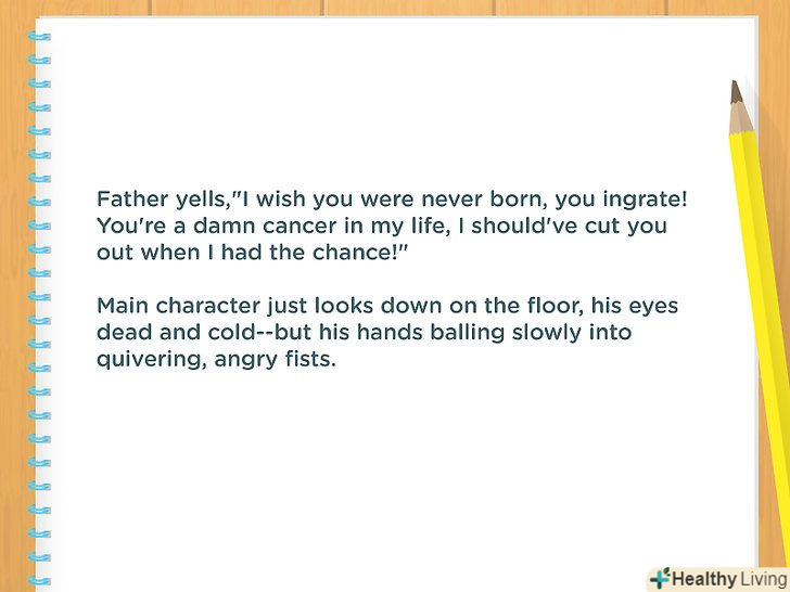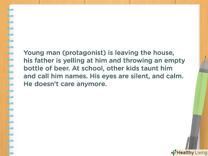Не відкладайте зав'язку.експозиція і зав'язка в короткометражному фільмі повинні займати не більше двох хвилин. Надайте необхідну інформацію про персонажа і суть конфлікту на початку фільму, щоб прикувати глядача до екрану.[10]- Наприклад, в першій сцені головний герой виходить з дому і відправляється в школу. В цей час його вичитує батько-алкоголік, а в школі його ображають хулігани.