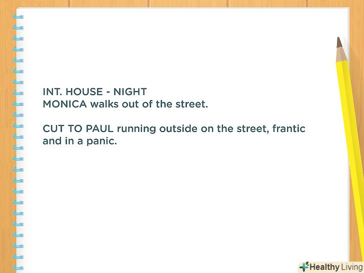 Формат сценарію.у сценаріях використовується особливий формат, який спрощує процес читання тексту. Виконайте форматування вручну або використовуйте програми для сценаристів на кшталт Final Cut і Movie Magic. Використовуються такі елементи:- Заголовки сцен: вказуються великими літерами на початку кожної сцени, щоб пояснити місце дії і час дня. Використовують позначення INT (інтер'єр), якщо дія відбувається в приміщенні, або EXT (екстер'єр), якщо події розвиваються поза приміщенням. Приклад « " INT. Будинок-Ніч " або " EXT. ДОРОГА-ДЕНЬ"»
