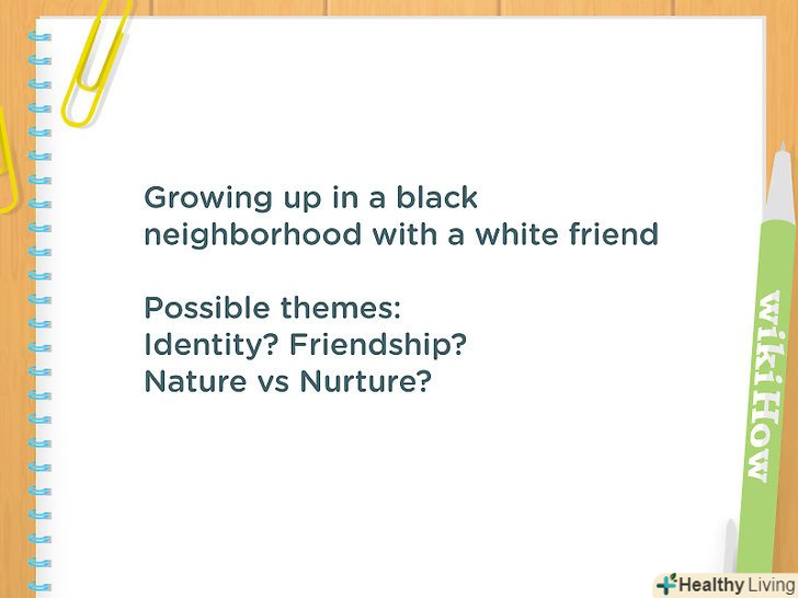Зосередьтеся на конкретній темі.в якості натхнення можна використовувати загальні теми на кшталт» ідентичності«,» втрати «або»дружби". Додайте власну інтерпретацію, щоб досягти ефекту свіжості та новизни.[2]- Наприклад, зосередьтеся на» ідентичності " і зніміть фільм про батьків, які росли в бідності і несприятливому районі. Виберіть тему "дружби" і покажіть дружбу між дитиною і дорослою людиною.
