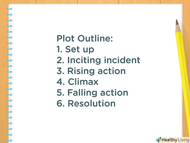 СкладітьПлан сюжету .план сюжету зазвичай включає шість частин: експозицію, зав'язку, розвиток дії, кульмінацію, згортання дії і розв'язку. Будь-яка короткометражка повинна включати всі ці елементи. Приклад плану сюжету:[4]- Експозиція: введіть місце дії, протагоніста і конфлікт. Наприклад, хлопець прагне до успіхів у навчанні, а вдома постійно свариться з батьком-алкоголіком.