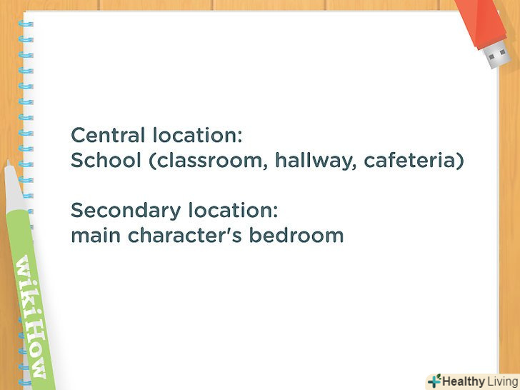 Використовуйте обмежену кількість місць і персонажів.обмежтеся одним, двома або трьома персонажами, щоб сценарій був коротким і успішним. Це ж стосується і місця дії. Тоді вам не доведеться витрачати додаткові кошти на велику кількість знімальних майданчиків і акторів, а сценарій буде стислим і зосередженим.[11]- Наприклад, в якості центрального місця дії можна вибирати школу, а додаткового — спальню головного героя.