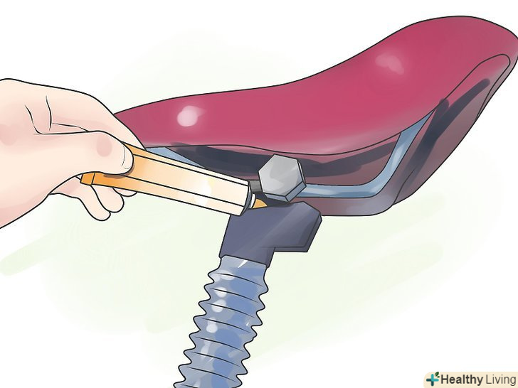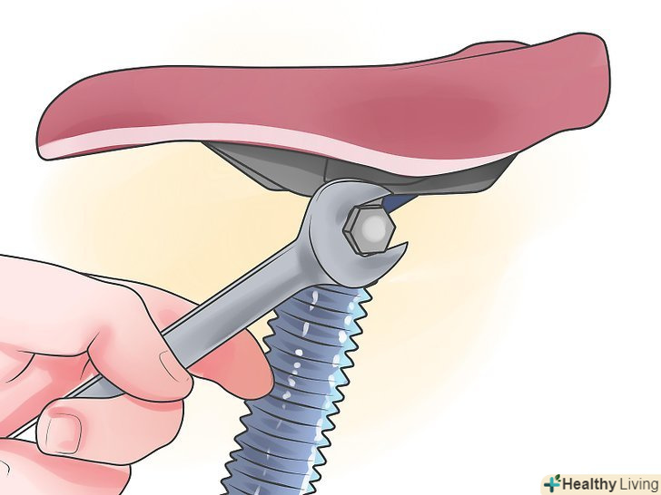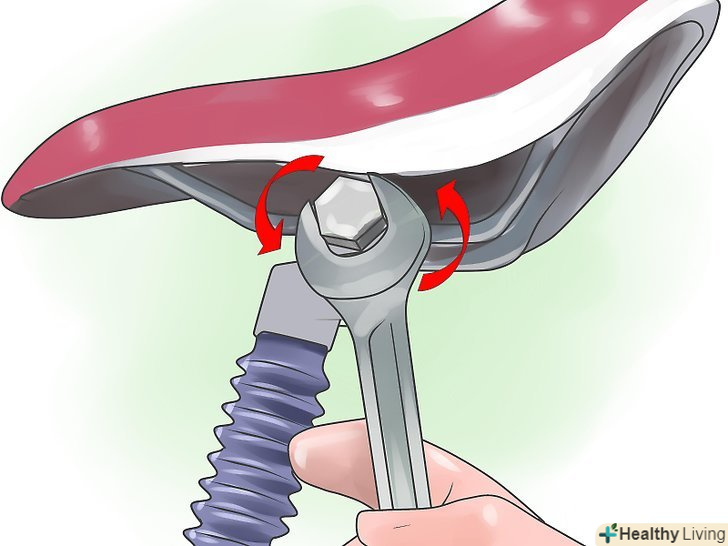 Розкрутіть болт або кріплення важеля сідлотримача.подивіться під сидіння велосипеда, чи є там важіль, який можна потягнути, або може там є болт, який потрібно послабити храповиком або гайковим ключем. Сідлодержатель складається в раму велосипеда і ця цілком Вільна посадка називається підсідельна труба рами. Сідлодержатель утримується в підсідельній трубі рами за допомогою стопорного болта або важеля ексцетрикового затиску. Якщо є важіль ексцетрикового затиску, то вам не знадобляться інструменти для підйому сидіння. Якщо є болт, то вам знадобиться храповик, гайковий або універсальний ключ. Для більшості седлодержателей потрібен гайковий ключ на 13 або 14 мм або універсальний на 5 або 6 мм.[5] послабте болт, відкручуючи його вліво або проти годинникової стрілки.