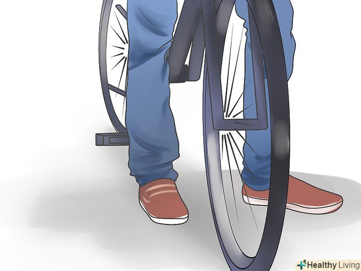 Станьте поруч з велосипедом.Тримайте велосипед за кермо і попросіть когось вам допомогти, щоб велосипед стояв рівно і не кренився або гойдався. Самостійно сядьте на сидіння. Весь ваш вага не повинен утримуватися тільки лише велосипедним сидінням або сідлом. Вага розподіляється між сідлом, педалями, на яких розташовуються ноги, і кермі, за який ви тримаєтеся руками.[1]