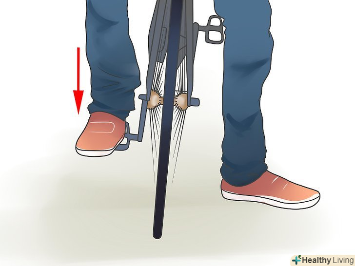 Нехай одна педаль вільно обертається. Ступень торкніться цієї педалі. Не нахиляйте велосипед. Є різні тлумачення, яким повинен бути кут зігнутого коліна, але зазвичай коліно згинається під кутом 5 градусів (тому нога злегка зігнута в коліні і нога не повністю розпрямлена) і цього достатньо, щоб ви сіли на сидінні і дістали ногою педалі в її нижньому положенні обертання.