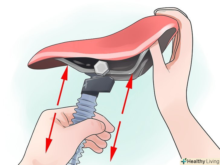 Відрегулюйте кут нахилу сидіння вгору або вниз.для чоловіків більш комфортно, якщо носик сидіння трохи піднятий вгору, жінкам же більш зручно, якщо носик трохи опущений.[10] цей нахил незначний. Не нахиляйте сидіння дуже сильно; навіть, незважаючи на те, що під час сидіння на велосипеді це може здатися зручним, то під час їзди – може створити додаткове навантаження на руки і плечі. Якщо сидіння буде занадто нахилене вниз, то під час їзди ви будете з'їжджати з нього. І тому ви будете відштовхуватися руками від керма назад, що створить додаткове навантаження на руки під час їзди.