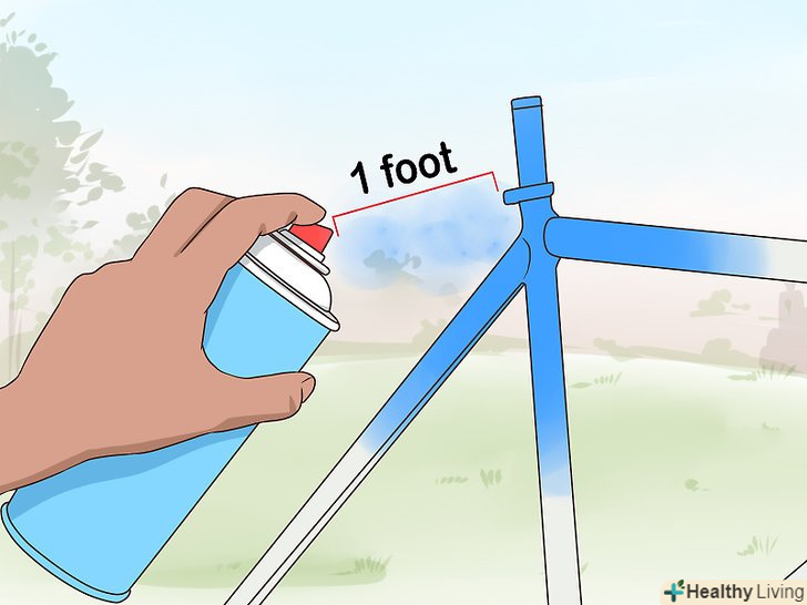 Нанесіть на раму перший шар аерозольної фарби.коли розпилюєте фарбу, тримайте балончик з фарбою на відстані близько 30 см від рами і постійно переміщуйте його. Намагайтеся довго не затримуватися на одному місці, інакше фарба почне підтікати. Обійдіть всю раму навколо, щоб повністю покрити її фарбою.[13]- Не переживайте, якщо на даному етапі стара фарба буде трохи просвічуватися крізь нову. Вам необхідно пофарбувати раму декількома тонкими шарами фарби, а не одним товстим шаром. Стара фарба сховається наступними шарами нової фарби, які ви завдасте пізніше.[14]